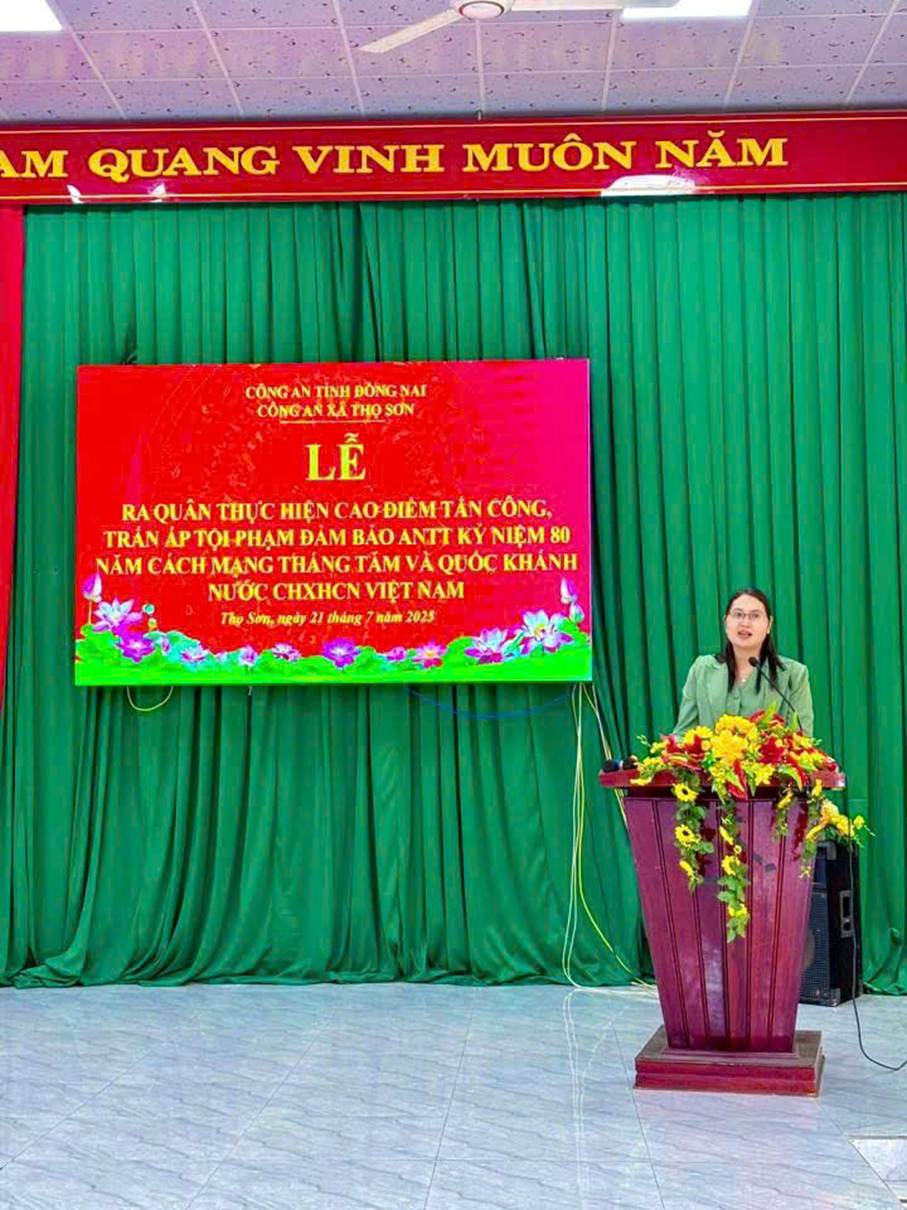 Buổi lễ vinh dự đón tiếp đồng chí Điểu Thị Hạnh – Phó Chủ tịch UBND xã, cùng đại diện các ban ngành, đoàn thể xã Thọ Sơn đến tham dự và chỉ đạo. Sự hiện diện của các cấp lãnh đạo thể hiện sự quan tâm sâu sắc và tin tưởng vào lực lượng công an cơ sở, động viên cán bộ, chiến sĩ hoàn thành xuất sắc nhiệm vụ được giao.