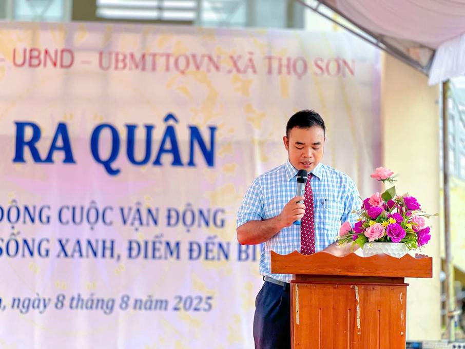 Phát biểu tại buổi lễ, ông Điểu Khuê – Ủy viên Ban Thường vụ, Chủ tịch Ủy ban MTTQ Việt Nam xã nhấn mạnh: "Cuộc vận động ‘Thọ Sơn – Cuộc sống xanh, Điểm đến bình yên’ không chỉ là một khẩu hiệu hay phong trào ngắn hạn, mà phải trở thành hành động thường xuyên, liên tục của từng hộ gia đình, từng thôn, từng tổ chức và mỗi người dân. Mỗi cán bộ, đảng viên, đoàn thể, tôn giáo hãy là một tuyên truyền viên tích cực, xây dựng môi trường Sáng – Xanh – Sạch – Đẹp, đảm bảo trật tự an toàn xã hội, đồng thời quảng bá hình ảnh quê hương đến du khách."